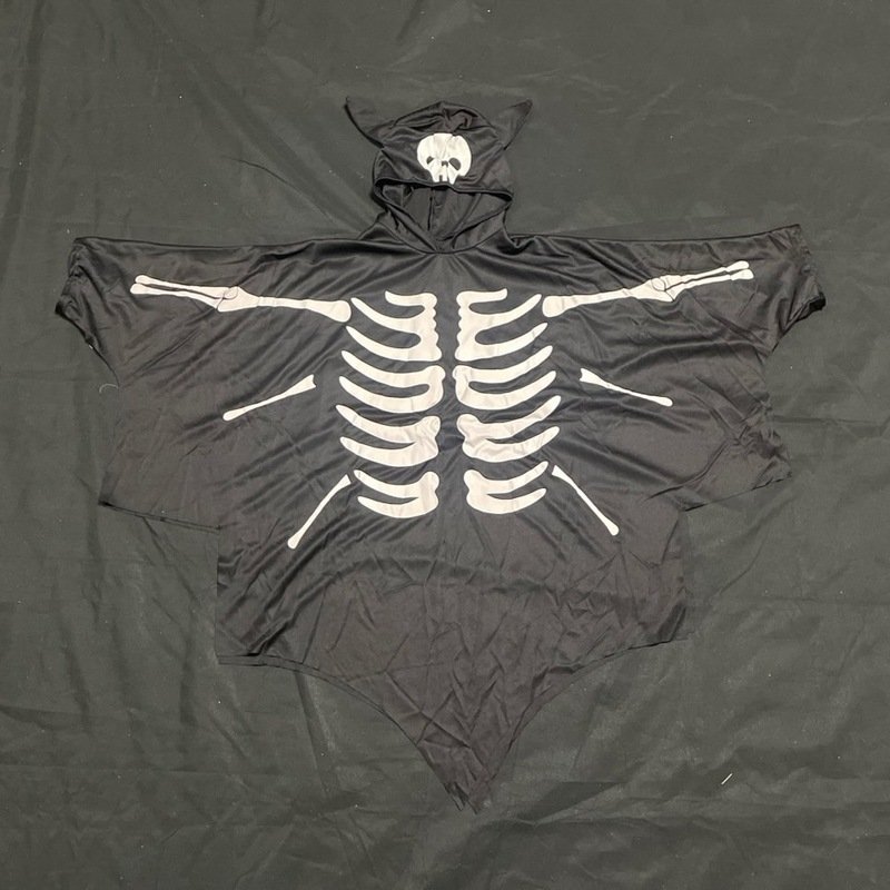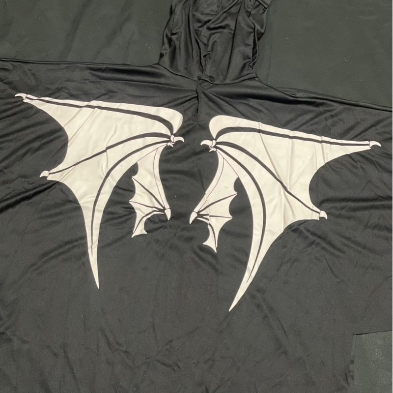 มาเป็นเสื้อทรงค้างคาวมีฮู้ด สกรีนลายกระดูกด้านหน้า และลายปีกค้างคาวที่ด้านหลัง “เรืองแสงได้”