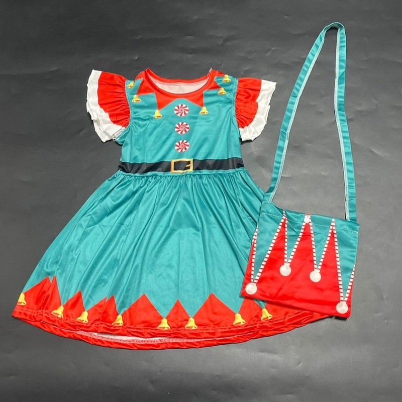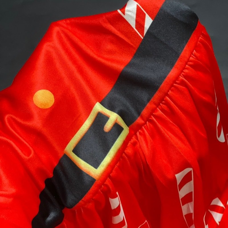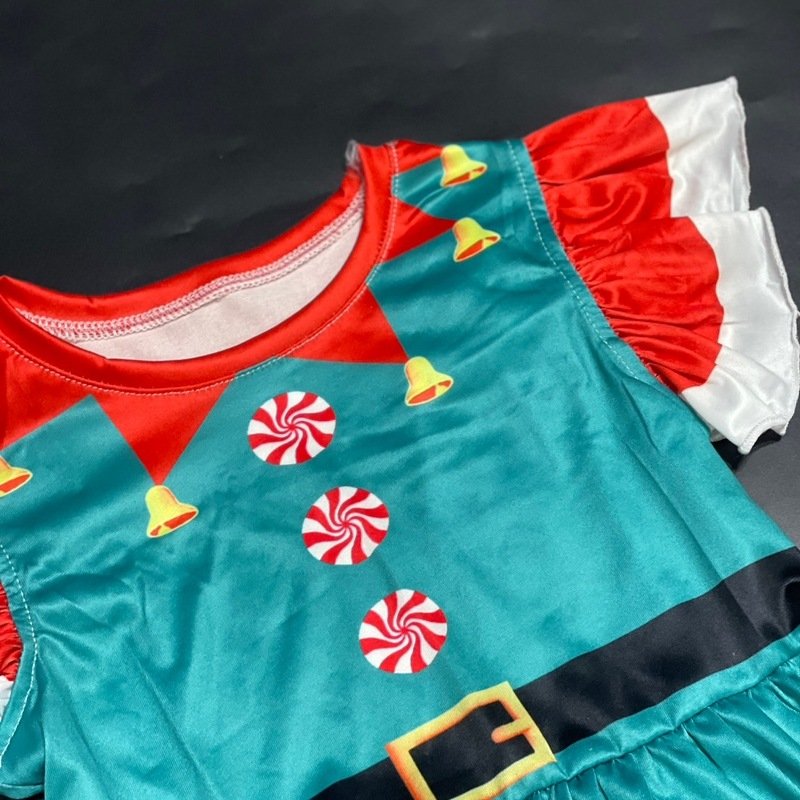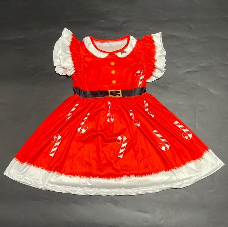 ชุดแฟนซีเด็ก เดรส xmas แขนระบาย พิมพ์ลายเข็มขัด กระดุมด้านหน้า น่ารักใส่สบายๆ ชุด xmas เด็กโต