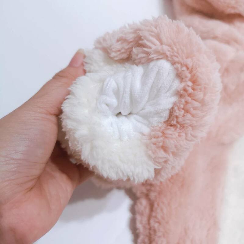 เป็นชุดตัวยาวขนปุยนี่มๆ มีหูและติดดอกไม้สีม่วงน่านักๆ ซิปด้านหน้า ถอดง่ายไม่คัน