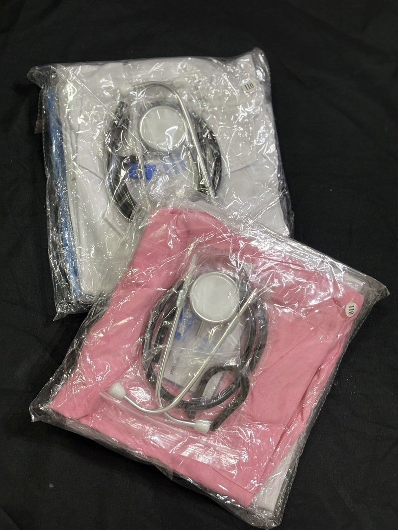 ครบเซ็ต: เสื้อคลุมด้านนอก + เสื้อด้านใน + กางเกง + หมวก + เครื่องฟังหัวใจ + แมส + ป้ายชื่อ