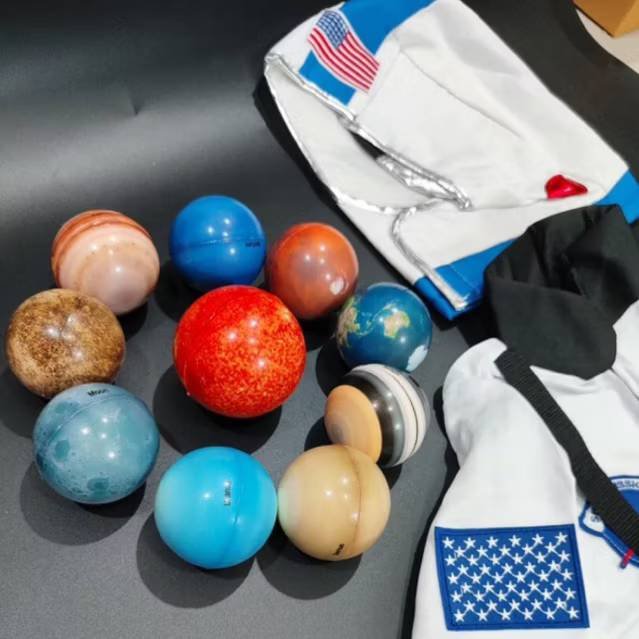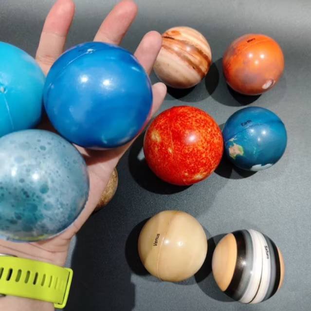 โมเดลจำลอง 10 ลูก เป็นระบบสุริยะจักรวาล Solar System วัสดุเป็นลูกบอล เนื้อนุ่ม เด้งได้ ให้เด็กได้สัมผัส บีบ เรียนรู้ดาวรอบๆ โลก พร้อมพัฒนากล้ามเนื้อมัดเล็กโดยลูกบอลแต่ละลูกจะมีชื่อดาวกำกับไว้ ให้เด็กได้สนุกและจดจำผ่านการเล่น