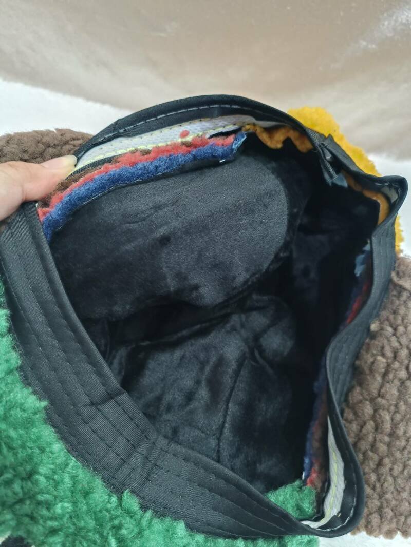 ด้านในบุผ้ากำมะหยี่นุ่มใส่สบาย ด้านนอกเป็นขนแกะฟูๆ ให้ความอบอุ่นดีเยี่ยม เพิ่มดีเทลสุดคิวต์ด้วยงานปักลูกตาตรงปีกหมวกด้านใน พับโชว์ได้ เก๋สุดๆ ด้านข้างมีปีกยื่นออกมาเพิ่มมิติ และมีเชือกห้อยตกแต่ง ใส่แล้วน่ารักโดดเด่นมากค่ะ