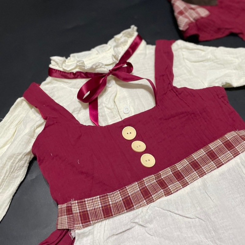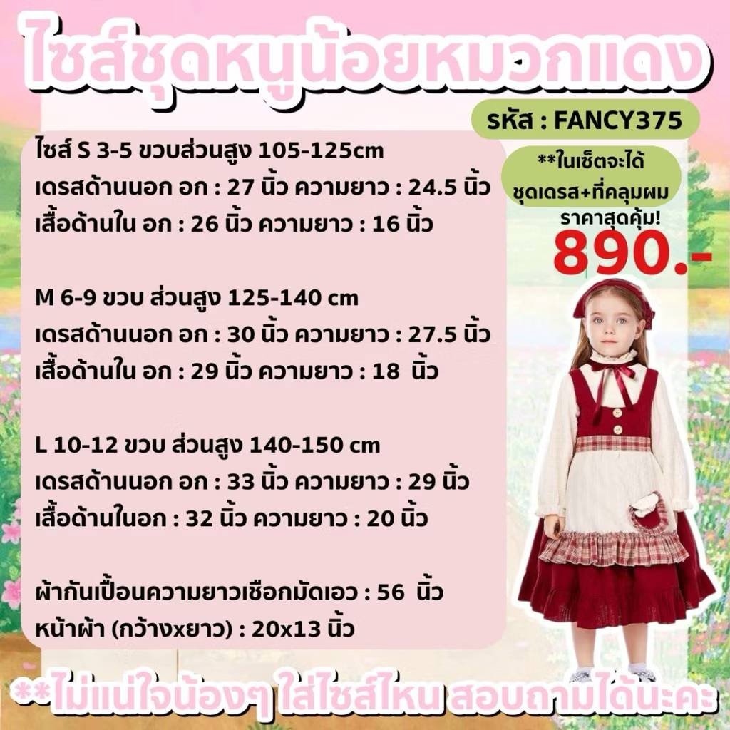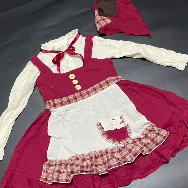 ชุดนานาชาติเด็ก ยุโรป หนูน้อยหมวกแดง มาเป็นเสื้อแขนยาวริบบิ้นคอ / เอี๊ยมกระโปรงสีเลือดหมู / ผ้าคาดเอวระบาย / ผ้าโพกศีรษะ