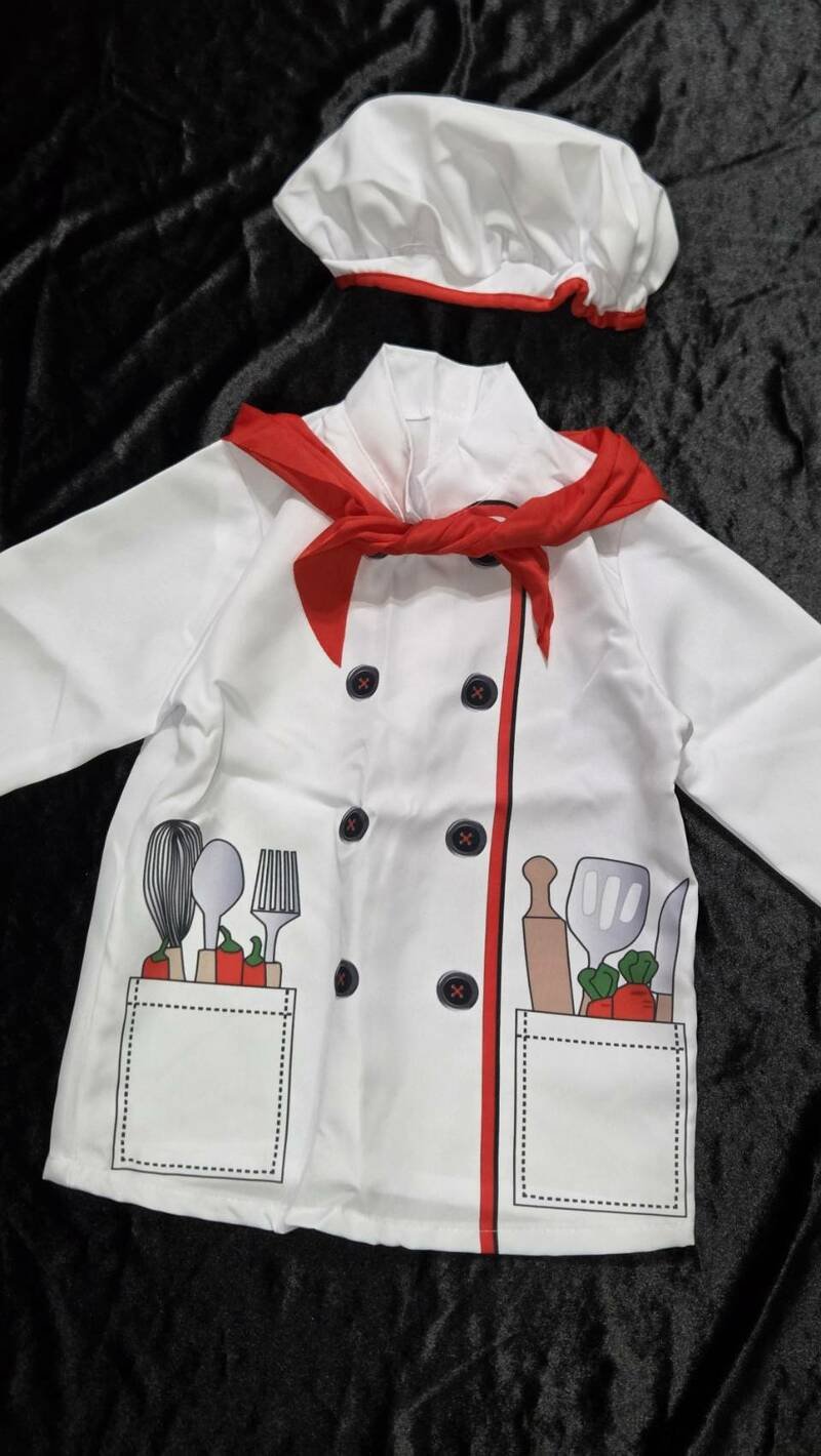 มาเป็นเสื้อเชฟ 1 ตัว ผ้าพันคอ 1 ชิ้น หมวก 1 ใบ ดีไซน์ลวดลายน่ารักเหมือนมีอุปกรณ์พ่อครัวที่กระเป๋า