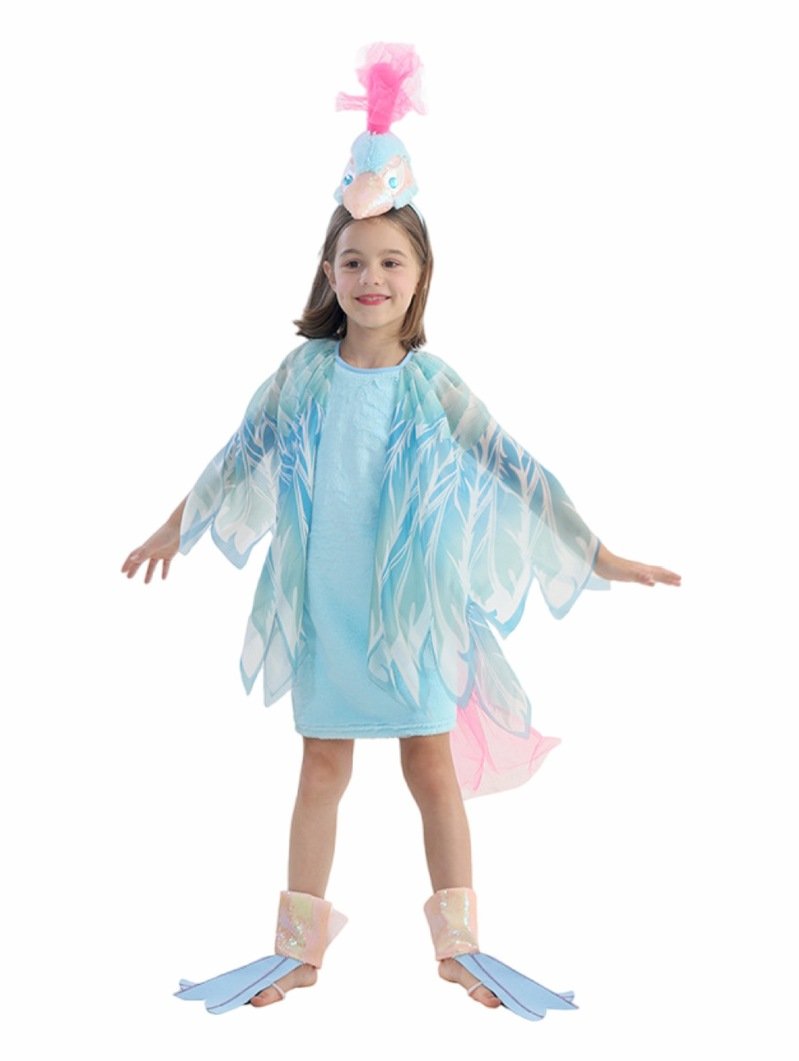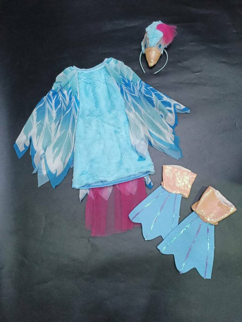 ชุดแฟนซีนกยูง เดรสสีฟ้าสดใส ด้านหน้าผ้าขนนุ่ม ด้านหลังผ้าเบา ใส่สบาย มีจั๊มเอวและผ้าพลิ้วบางด้านข้าง เพิ่มความพริ้วไหว เสริมดีเทลด้วยผ้าตาข่ายสีบานเย็นด้านหลัง
