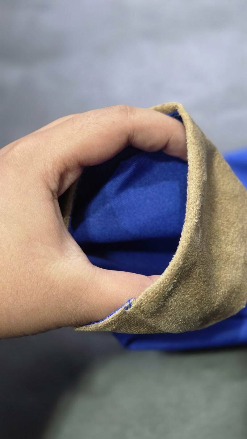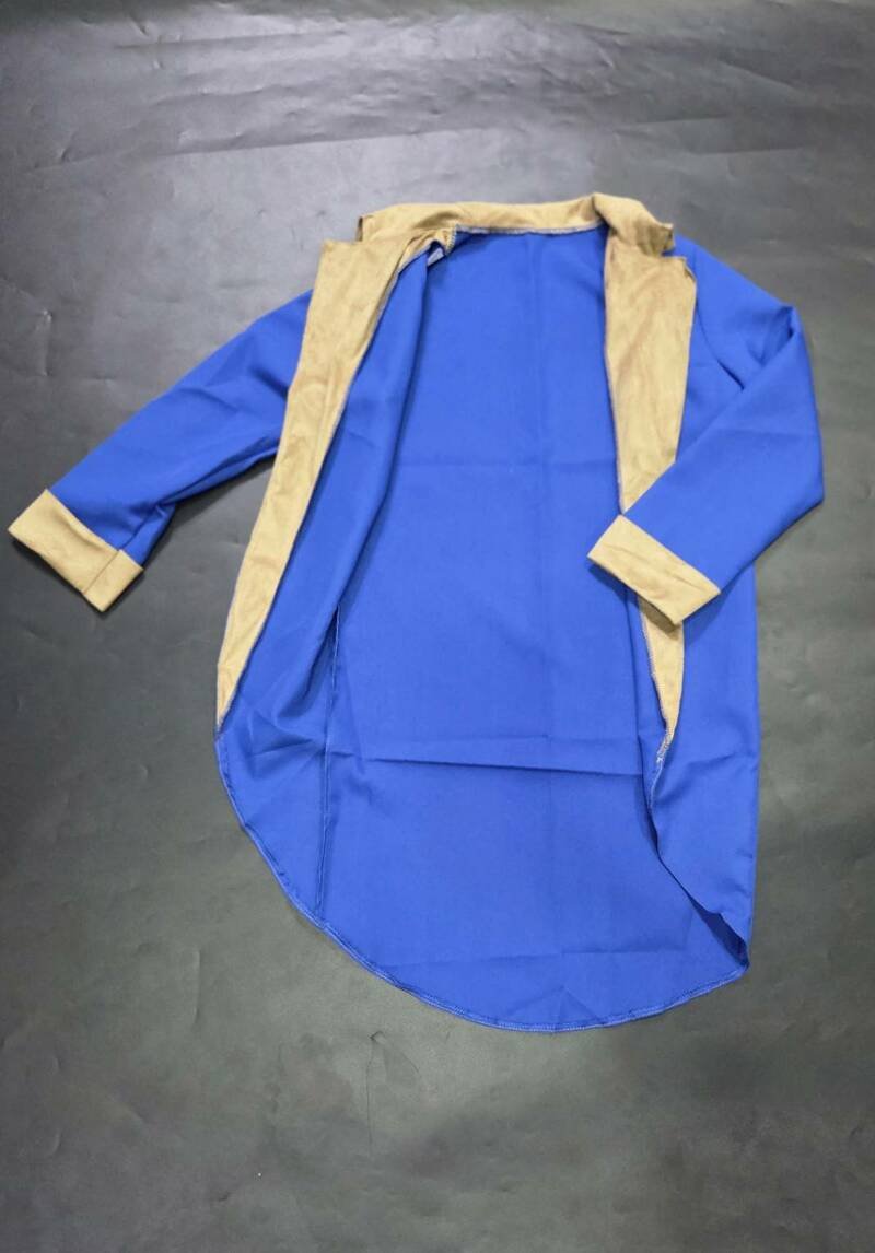และเสื้อโค้ทตัวยาวด้านนอกสีน้ำเงินเข้ม ตัดต่อปกและขอบแขนด้วยผ้าสีน้ำตาลเข้าชุด