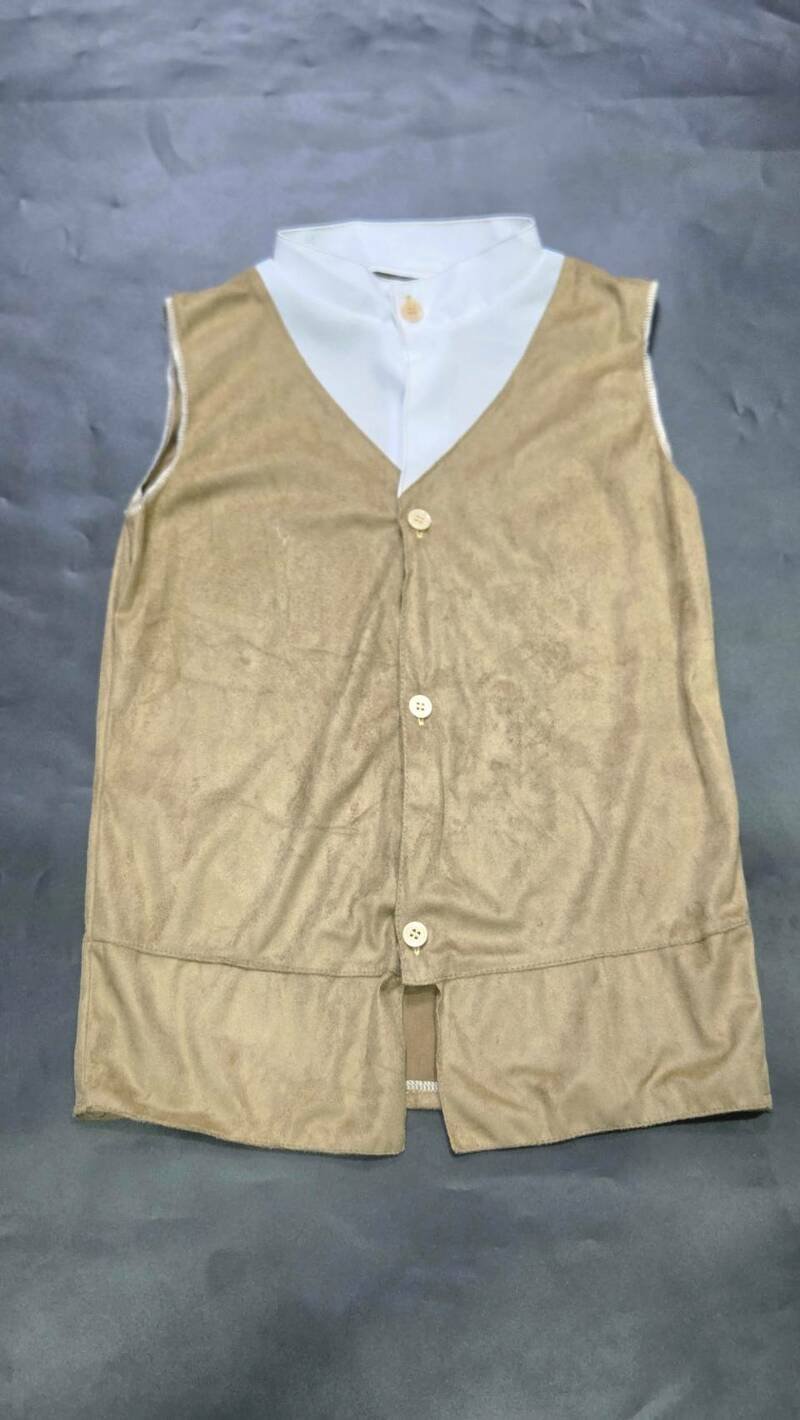 เสื้อกั๊กสีน้ำตาลอ่อนมีกระดุมให้ติด เนื้อผ้าบางเบาสบายไม่อึดอัดไม่คัน มาพร้อมผ้าผูกคอสีขาวซาตินนำมาไว้ตรงคอเข้าชุด